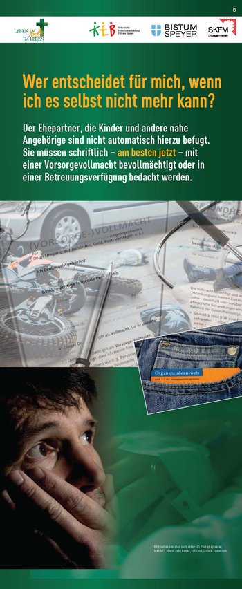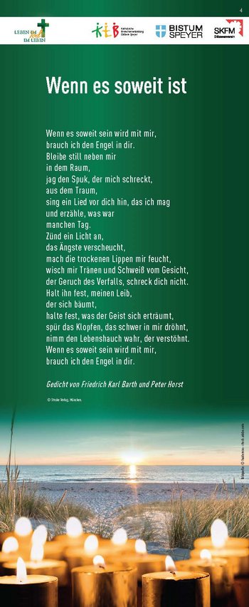 So kann es hilfreich und entlastend sein, wenn man sich frühzeitig und ohne Not oder Betroffenheit den eigenen Unsicherheiten und offenen Fragen stellt, versucht Klarheit zu schaffen und mit möglichst klaren Regelungen Vorsorge trifft. Die Ausstellung bietet eine Möglichkeit, ganz unterschiedliche Aspekte des Themas aufzugreifen und Räume zu eröffnen, den religiösen, ethischen, medizinischen, juristischen oder auch ganz persönlichen Fragen zu Sterben, Tod und Trauer nachzugehen.