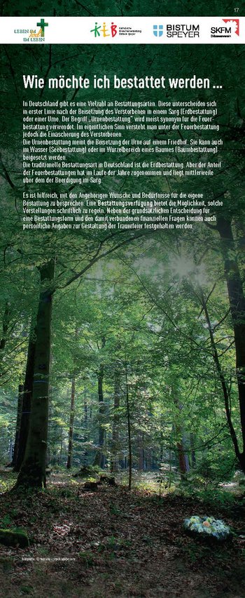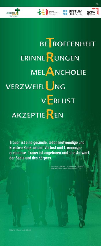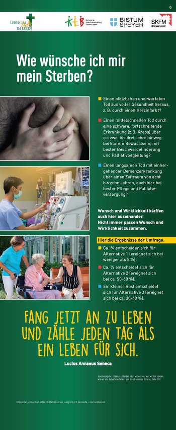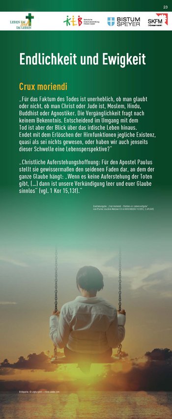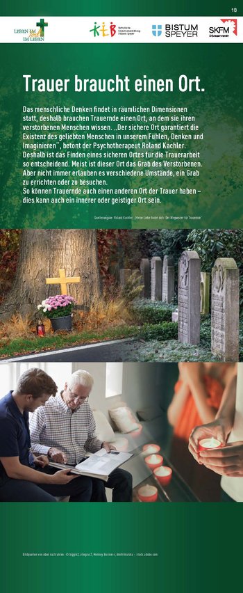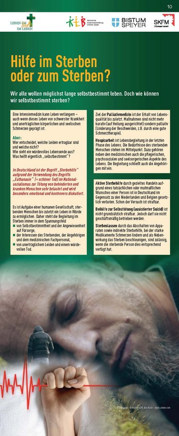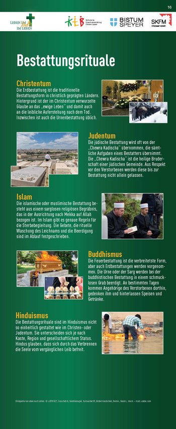 Konzipiert wurde die Ausstellung von der Katholischen Erwachsenenbildung, dem Referat Hospiz- und Trauerseelsorge und dem Sozialdienst Katholischer Frauen und Männer zum einen als analoge Wanderausstellung auf 23 Rollups, die ausgeliehen und im eigenen Raum gezeigt werden können. Zum anderen steht sie in einem „digitalen Ausstellungsraum“ zur Verfügung, auf den man unter www.lebenimtod.de von überall her zugreifen kann. Hier sind ebenfalls die Begleitmaterialien zum download bereitgestellt. So wird die Ausstellung für vielerlei Veranstaltungen nutzbar – analog wie digital.